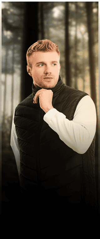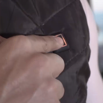 Connect your power bank or battery to the USB port found inside the vest’s inner pocket. Activate the heating zones by pressing and holding the power button for 3 seconds located on the left chest.