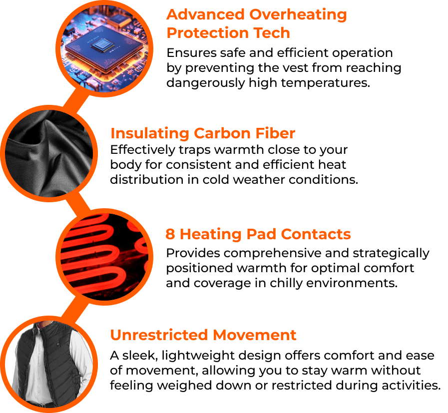 Equipped with 8 strategically placed heating pads—five on the back, two on the front, and one on the neck—the Alpha Heat Vest delivers targeted warmth where you need it most. Choose from three heat settings (low, medium, and high) to find your perfect level of comfort.
